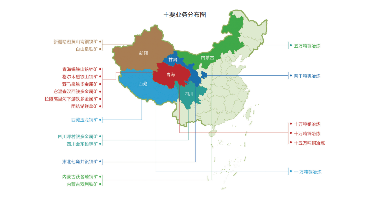 公司全资持有或控股并经营十四座矿山,其中,有色金属矿山7座、铁及铁多金属矿山6座、盐湖矿山1座:青海锡铁山铅锌矿、内蒙古获各琦铜矿、内蒙古双利铁矿、新疆哈密白山泉铁矿、甘肃肃北七角井钒铁矿、青海格尔木磁铁山铁矿、青海格尔木野马泉铁多金属矿、青海格尔木它温查汉西铁多金属矿、青海格尔木拉陵高里河下游铁多金属矿、青海格尔木团结湖镁盐矿、四川呷村银多金属矿、四川会东大梁铅锌矿、西藏玉龙铜矿及新疆瑞伦铜镍矿,主要产品有铅精矿、锌精矿、铜精矿、铁精粉、球团等。