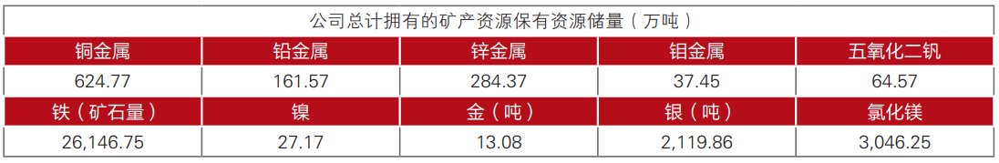资源储量 :公司已在国内拥有众多优势矿产资源,截至2022年12月31日,共有探矿权7个,面积70.71km² ;采矿权13个,面积62.82 km²,资源拥有量居国内金属矿业企业前列。