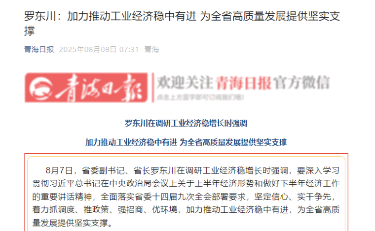 8月7日,省委副书记、省长罗东川在调研工业经济稳增长时强调,要深入学习贯彻习近平总书记在中央政治局会议上关于上半年经济形势和做好下半年经济工作的重要讲话精神,全面落实省委十四届九次全会部署要求,坚定信心、实干争先,着力抓调度、推政策、强招商、优环境,加力推动工业经济稳中有进,为全省高质量发展提供坚实支撑。