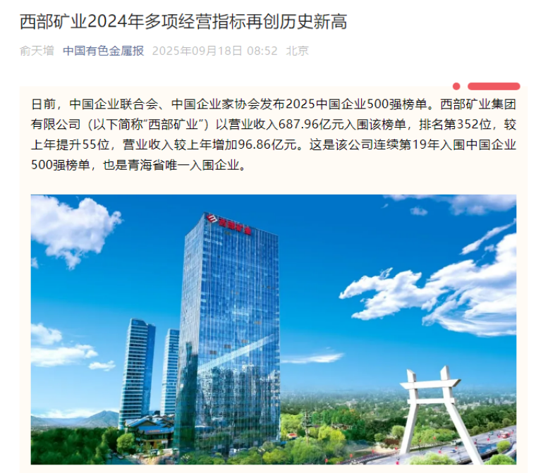 日前,中国企业联合会、中国企业家协会发布2025中国企业500强榜单。西部矿业集团有限公司(以下简称“西部矿业”)以营业收入687.96亿元入围该榜单,排名第352位,较上年提升55位,营业收入较上年增加96.86亿元。这是该公司连续第19年入围中国企业500强榜单,也是青海省唯一入围企业。