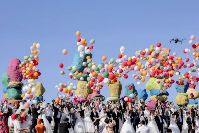 当一对对新人手挽手走过“亿万年”的时光,空气中便弥漫着爱的味道。8月29日七夕节,集团公司在伊吾胡杨景区为50对新人举办“情定胡杨•缘启新程”主题集体婚礼。这场融合了自然之美、爱国情怀、企业精神与人文温情的婚礼,不仅圆了新人们对特色婚礼的向往,更让公司“坚信、坚持、坚守”的企业精神与“艰苦奋斗,自强不息,扎根边疆,甘于奉献”的胡杨精神同频共振,在戈壁之上奏响爱与奋斗的乐章。