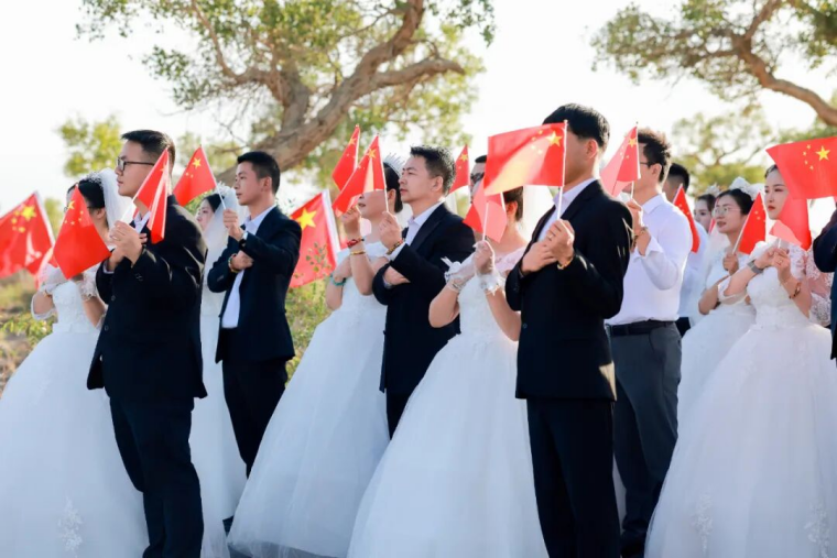 当温暖的阳光映红新娘、新郎的脸颊,也为高光的婚礼仪式铺上红地毯;当欢快的旋律响起,喜庆连着风撒遍布每一个角落,婚礼仪式郑重开始。2025面国旗与苍劲胡杨交织,营造出家国同庆、婚姻庄严的浓厚氛围。新人们在国旗下宣誓结为夫妻,以实际行动诠释“爱情与家国同在”的价值观,传承爱国爱家、相亲相爱的社会主义家庭文明新风尚。